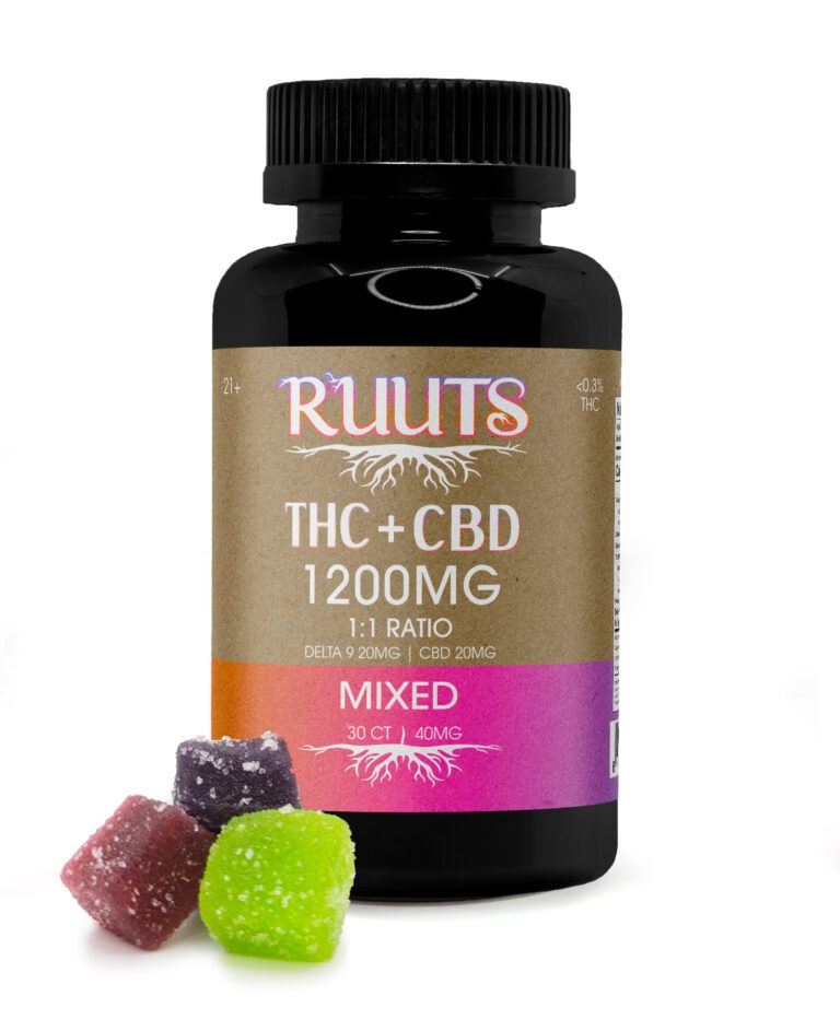 RUUTS 1:1 Delta-9 + CBD 1200mg Mixed Gummies (600mg THC- 600mg CBD, 30 count, 40mg each, Raspberry • Green Apple • Grape): Experience balanced elevation with RUUTS Mixed Gummies, a harmonious 1:1 blend of Delta-9 THC and CBD crafted for centered, grounded relief. Each gummy pairs 20mg of Delta-9 with 20mg of CBD, offering a steady, approachable experience whether you are unwinding after a long day or seeking a gentle lift in your routine. The bright snap of Green Apple, the bold sweetness of Raspberry, and the deep richness of Grape come together in a vibrant trio of flavors that awaken the senses while keeping you rooted in calm. Created in the spirit of wellness and connection to the earth, RUUTS honors nature’s restorative power, offering gummies that support a more mindful, intentional way of living.